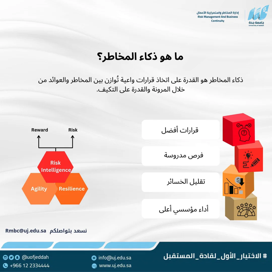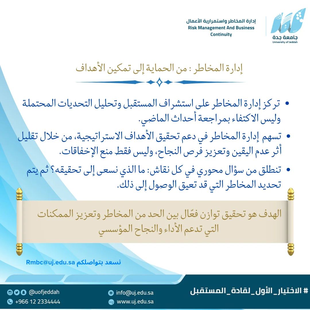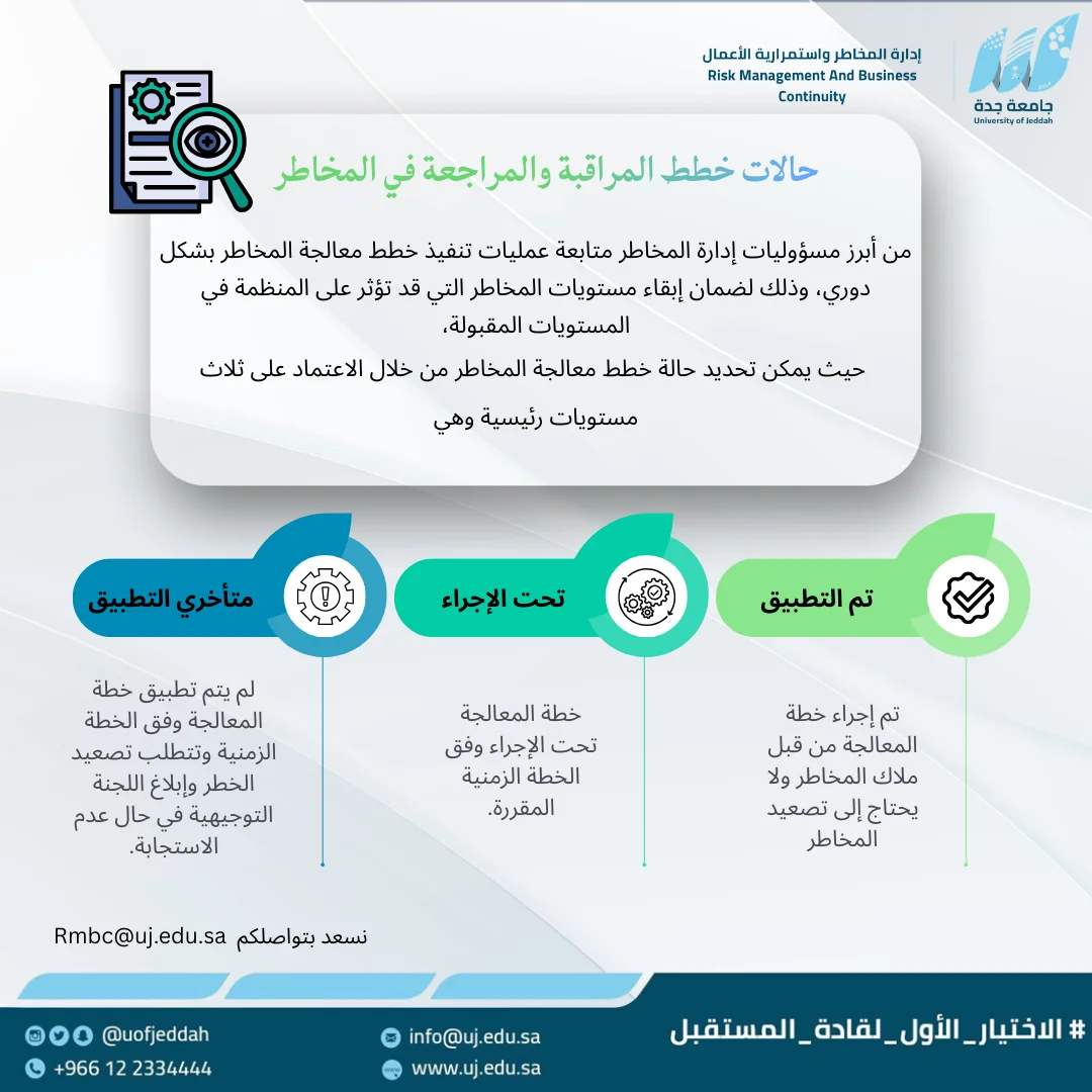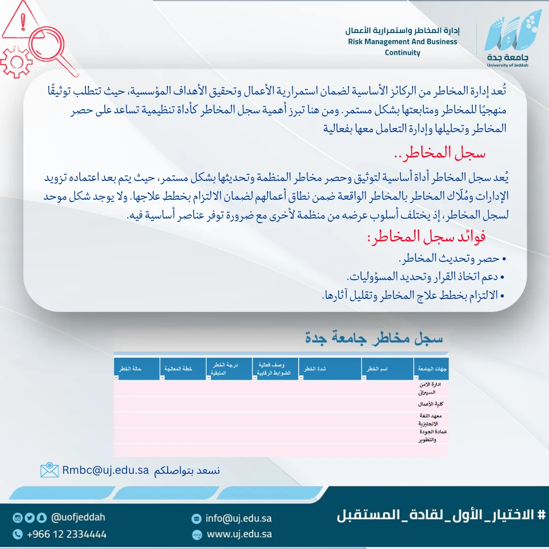 تحتوي الصفحة على صور توعوية تم نشرها عبر (تويتر -والبريد الجامعي )بهدف الوعي بثقافة إدارة المخاطر واستمرارية الاعمال.